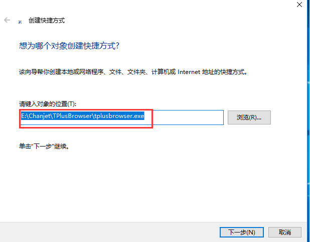2.在【对象的位置】里选择要打开的浏览器所在的路径,例如T+浏览器;