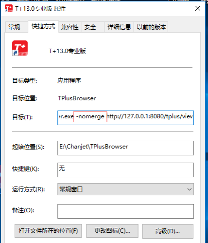 4.这样在桌面上就会有一个快捷键,选中这个快捷键右键点【属性】,然后在【目标】里按照下面的格式输入,前面部分是浏览器的安装路径,后面的地址是T+的登录地址,中间通过空格-nomerge进行连接;E:ChanjetTPlusBrowser plusbrowser.exe -nomergehttp://127.0.0.1:8080/tplus/view/login.html
