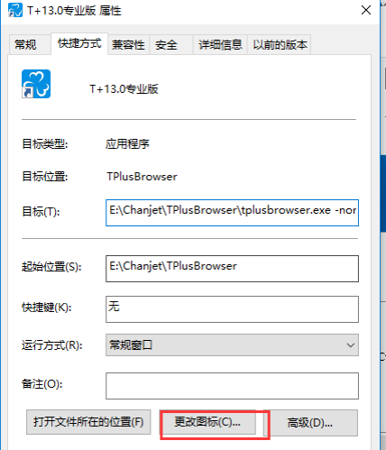 5.我们还可以点【更改图标】,把这个快捷键的显示图标改成T+的图片,可以从服务器电脑上找一个T+标志的图片,然后 放在客户端电脑上,【更改图标】的时候选择这个图标即可;